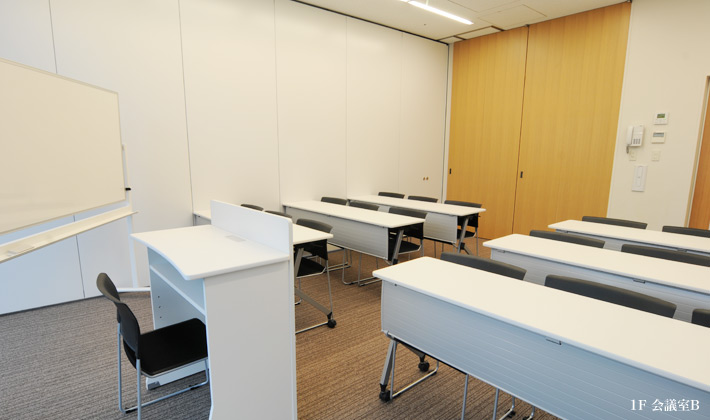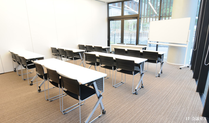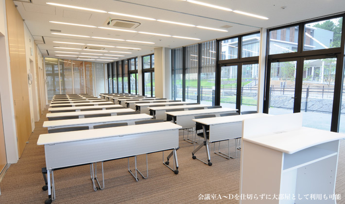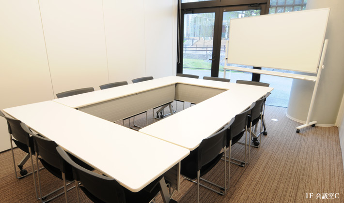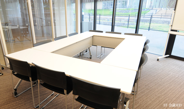 会議室は、まちづくりの拠点としての位置づけから、街からのアクセスのしやすい中心部のエントランスロビー、事務所近くに位置しています。室内で唯一飲食が可能な会議室は、パーテーションにて区切られているため、利用方法は多様で、分割による小会議室の利用のほか、大部屋として各種セミナー、公演とリンクした展示、レセプション会場などお客様の様々な用途に対応いたします。